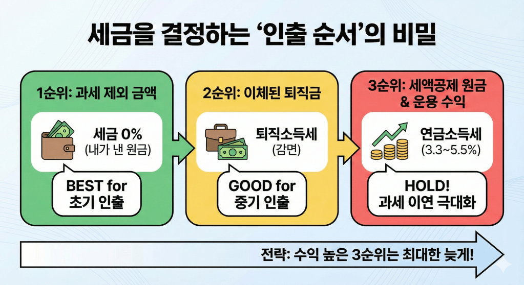 연금 계좌에는 성격이 다른 자산들이 섞여 있습니다. 국세청이 정한 인출 순서를 이해하면 세금을 내지 않아도 될 돈부터 꺼내 써서 과세 이연 효과를 극대화할 수 있습니다.