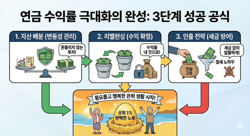 안녕하세요! 앞선 포스팅에서 자산 배분과 리밸런싱을 통해 ‘수준 높은 수익’을 만드는 법을 다뤘다면, 오늘은 그 결실을 온전히 내 주머니로 가져오는 **’인출 및 절세 전략’**을 소개합니다. 연금은 찾는 방법에 따라 실질 수익률이 10% 이상 차이 날 수 있습니다. 어렵게 불린 자산을 세금으로 허무하게 날리지 않는 3가지 핵심 전략을 정리해 드립니다.