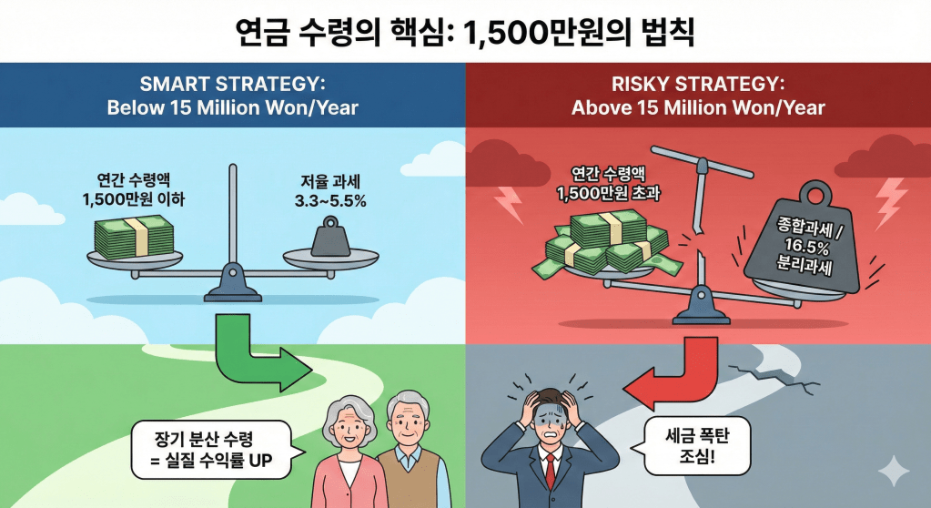 연금저축과 IRP 운용 시 가장 먼저 기억해야 할 숫자는 **’연간 수령액 1,500만 원’**입니다.